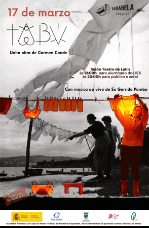 Tarabela Creativa presenta "TABÚ" de Carmen Conde Salón Teatro 12.00 h. alumnado dos IES 20.00 público xeral Entrada libre ata encher aforo.