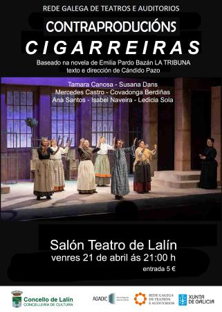 Contraproduccións presenta "CIGARREIRAS" Venres 21 de abril 21.00 h. Salón Teatro Entrada: 5€ Venda anticipada: Museo Municipal Ramón Mª Aller