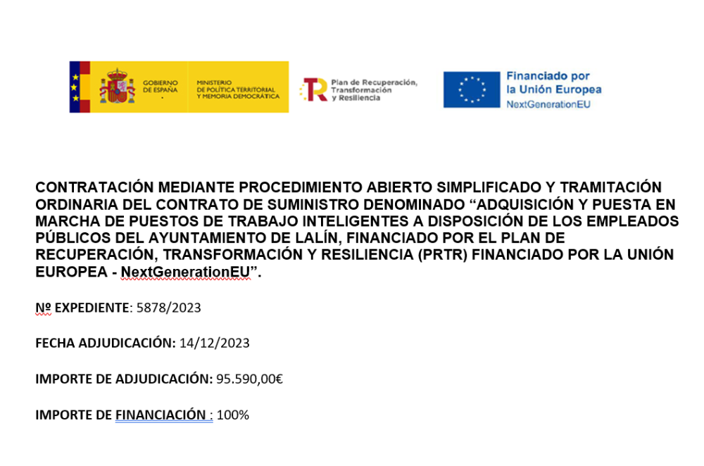 CONTRATACIÓN MEDIANTE PROCEDIMIENTO ABIERTO SIMPLIFICADO Y TRAMITACIÓN ORDINARIA DEL CONTRATO DE SUMINISTRO DENOMINADO “ADQUISICIÓN Y PUESTA EN MARCHA DE PUESTOS DE TRABAJO INTELIGENTES A DISPOSICIÓN DE LOS EMPLEADOS PÚBLICOS DEL AYUNTAMIENTO DE LALÍN, FINANCIADO POR EL PLAN DE RECUPERACIÓN, TRANSFORMACIÓN Y RESILIENCIA (PRTR) FINANCIADO POR LA UNIÓN EUROPEA - NextGenerationEU”.