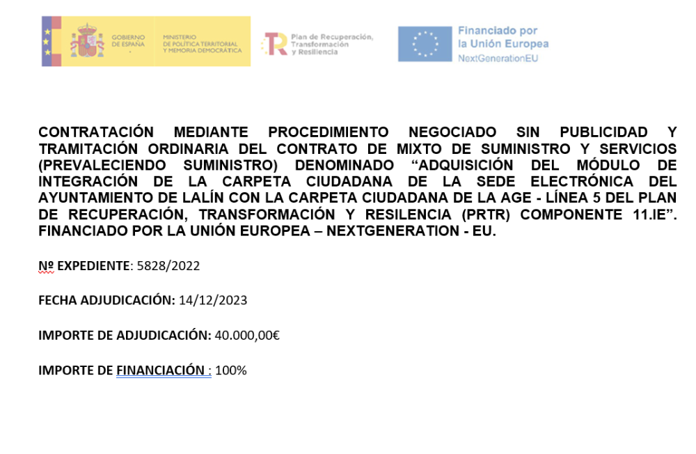 CONTRATACIÓN MEDIANTE PROCEDIMIENTO NEGOCIADO SIN PUBLICIDAD Y TRAMITACIÓN ORDINARIA DEL CONTRATO DE MIXTO DE SUMINISTRO Y SERVICIOS (PREVALECIENDO SUMINISTRO) DENOMINADO “ADQUISICIÓN DEL MÓDULO DE INTEGRACIÓN DE LA CARPETA CIUDADANA DE LA SEDE ELECTRÓNICA DEL AYUNTAMIENTO DE LALÍN CON LA CARPETA CIUDADANA DE LA AGE - LÍNEA 5 DEL PLAN DE RECUPERACIÓN, TRANSFORMACIÓN Y RESILENCIA (PRTR) COMPONENTE 11.IE”. FINANCIADO POR LA UNIÓN EUROPEA – NEXTGENERATION - EU.