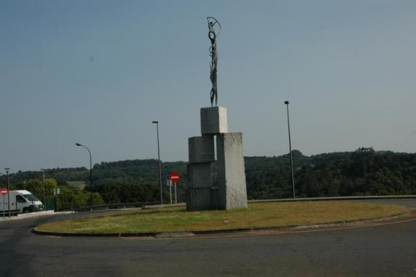 Marcado contraste entre o macizo pedestal de liñas rectas e a escultura curvada e recortada por múltiples ocos coa intención de alixeira-las figuras que avanzan unidas cara ó infinito.