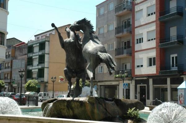No centro dunha fonte de base triangular redondeada nos vértices sobre unha rocha que bota auga, sitúase unha parella de cabalos rampantes. O autor acostuma a lle dar ás súas esculturas un apoio mínimo co fin de que mesmo semellen despegar do chan, por iso axudados dunha anatomía esaxerada, cada unha destas bestas soamente se sostén nunha das súas patas traseiras, malia que un deles tamén precisa afirma-la cola na rocha. Un dos equinos ergue totalmente o seu corpo, curvando pescozo e testa cara a atrás, nunha traxectoria que tenta a verticalidade. O seu compañeiro póusalle no lombo unha pata dianteira, de xeito que aínda que o título e as posturas nos din que estamos perante unha loita, dende algún dos puntos de vista desta escultura, mesmo se nos fai pensar nunha danza. Estes animais salvaxes axitan os seus corpos nunha exhibición de forza e enfrontamento, na mesma liña da obra que fixera para a Praza de España en Vigo. Fascinado polo mundo dos cabalos que monta, cría e admira dende moi novo, o escultor chega a converter esta paixón no eixe temático principal da súa obra. Esta fonte emprazada nunha encrucillada da vila, recalca o forte vínculo que une a traveso da historia, os cabalos coas terras de Lalín; a Feira do Vento que se celebraba na comarca cada mes de abril, ou a existencia da irmandade dos Cabaleiros de Deza son testemuños palpables desta ligazón.