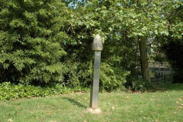 Obra composta de dúas pezas, unha delas feita de aceiro e pedra, ambos materiais fríos pero con distinta significación industrial.  A escena sitúase na beira da baranda que persegue o curso do río, resaltando e constrastando a horizontalidade daquela coa verticalidade en dous niveis de altura da escultura. Unha peza, feita dun paralelepípedo metálico soportado e coroado por formas pétreas, símbolo fálico, forma floral e mesmo personaxe antropomorfo sintetizado. A rentes do chan como se abrollara da herba, o segundo compoñente realizado só en pedra, apunta unha forma semellante á da coroa pero en outro estado temporal e formal; especie de abrocho semiaberto.