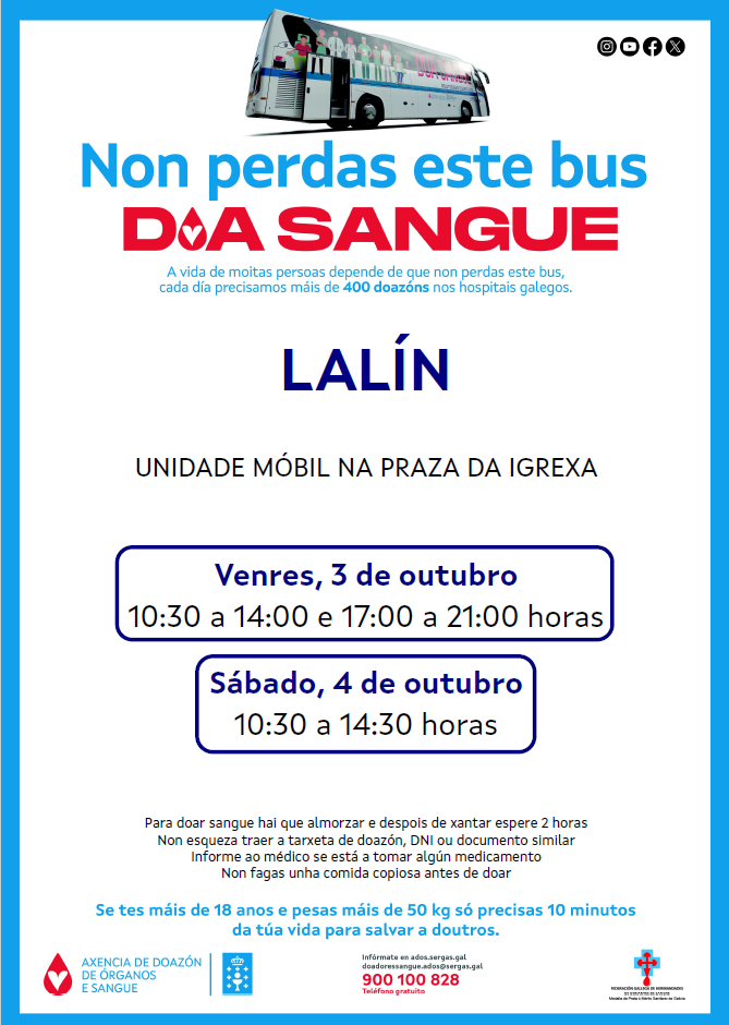 Lalín acolle unha nova campaña de doazón de sangue baixo o lema “Non perdas este bus, doa snague” o días: venres 3 de outubro en horario de 10.30 a 14 e de 17 a 21 h e o sábado 5 de outubro de 10.30 a 14.30 h. A unidade móbil estará instalada nesta ocasión na Praza da Igrexa.