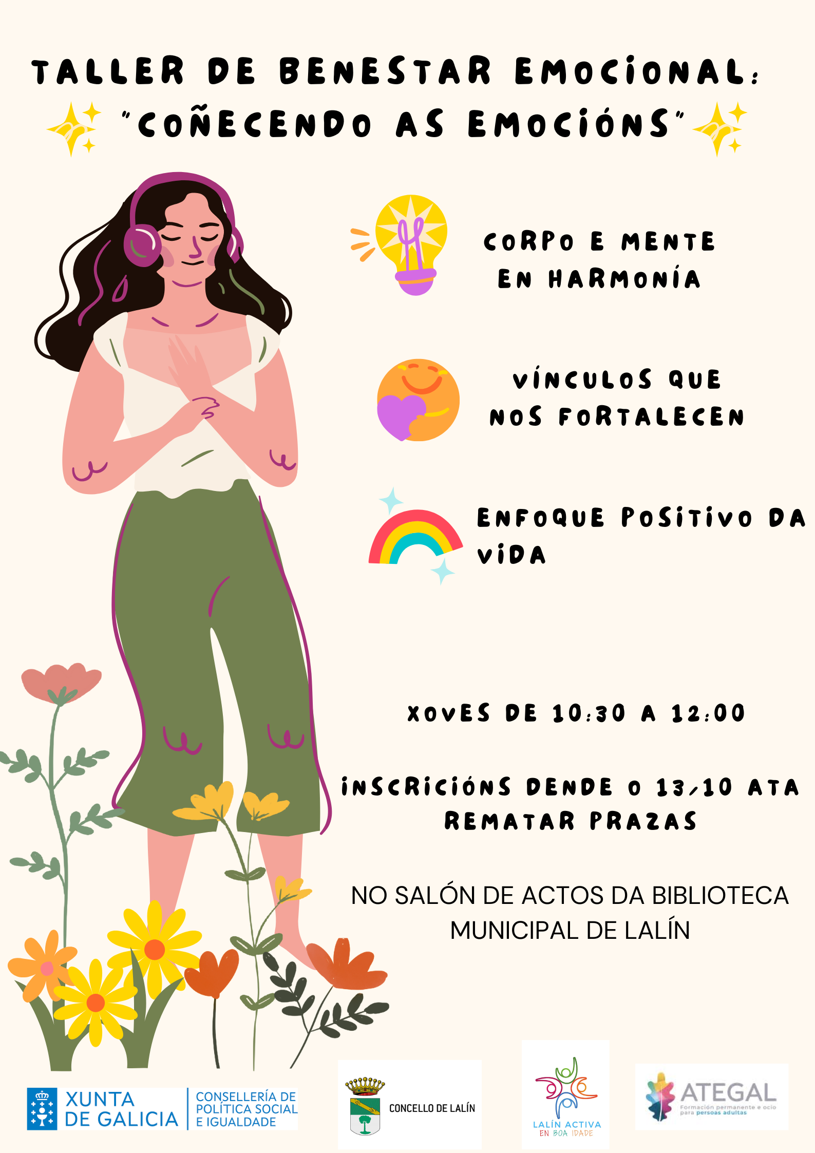 O próximo luns día 13 de outubro o Concello abre o prazo de inscrición para un novo grupo para o taller gratuíto de benestar emocional, impartido por ATEGAL en colaboración coa Consellería de Política Social e Igualdade da Xunta de Galicia e Afundación, que se desenvolverá baixo a temática “Coñecendo as emocións”. Os talleres desenvolveranse os xoves dende o 23 de outubro ao 22 de xaneiro en horario de 10:30 a 12:00 no Salón de Actos da Biblioteca Municipal de Lalín. A programación prevista dos talleres do novo grupo é: