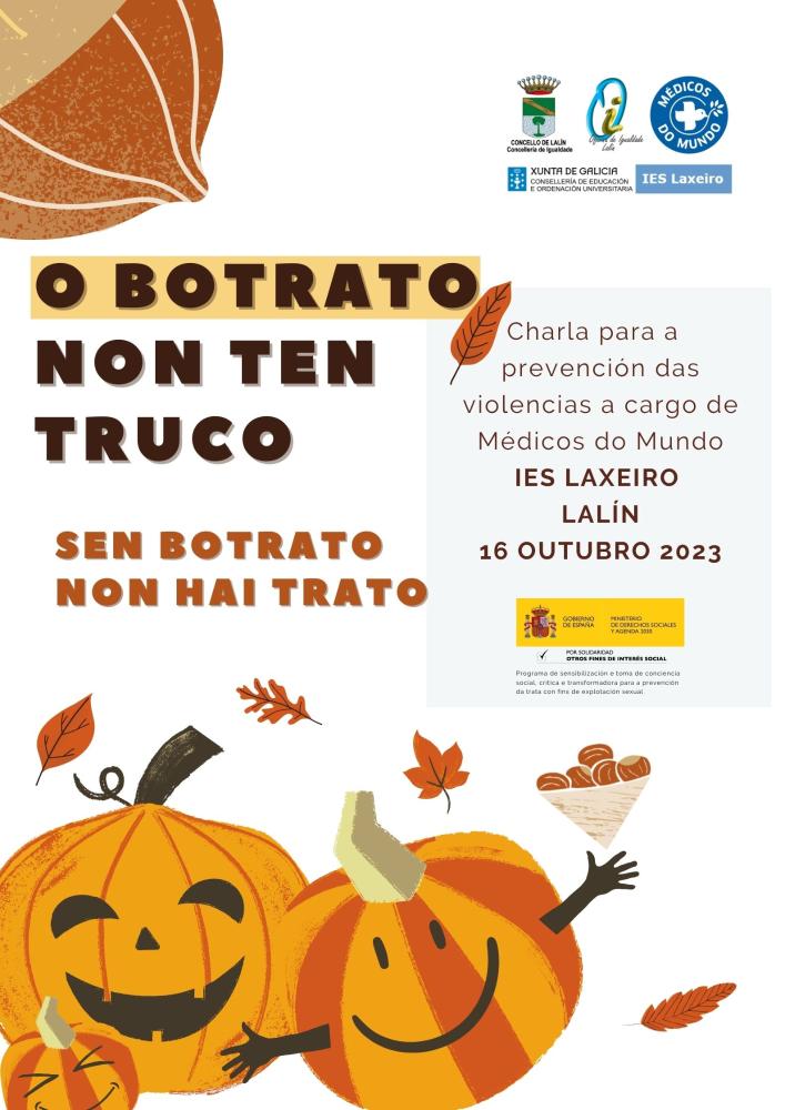O Concello de Lalín, desde a Oficina de Igualdade e a través da organización Médicos do Mundo, levará a cabo o vindeiro luns, 16 de outubro desde as 11:00h unha charla sobre o “botrato” para alumnado de 1º e 2º de FP básica no IES Laxeiro de Lalín, no marco do programa Sensibilización e toma de conciencia social, crítica e transformadora para a prevención da trata con fins de explotación sexual, explica a responsable municipal de Igualdade, Carmen Canda.