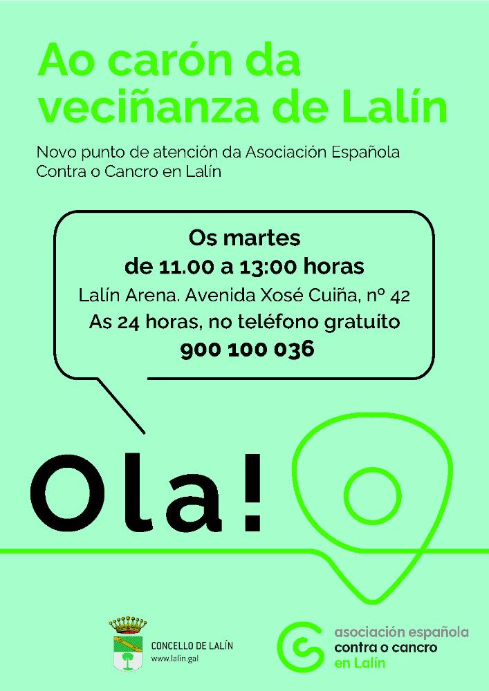Ademais deste punto físico no Concello de Lalín, a asociación ten a disposición dos/as pacientes oncolóxicos/as e familiares un número gratuíto e 24 horas, os 365 días do ano, o 900 100 036, onde un equipo de profesionais ofrecerán información, apoio, axuda e asesoramento.