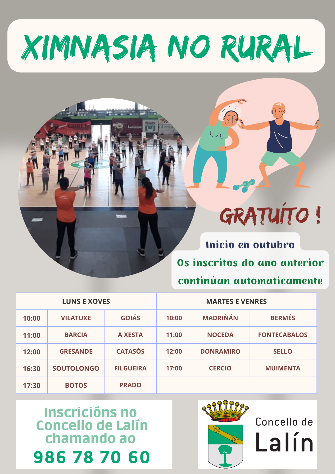 Xa entrando en detalles, o concelleiro explicou que “as clases comezarán o luns 17 e rematarán en Xuño. Terán lugar os luns e xoves, ás 10 horas en Vilatuxe e Goiás, ás 11:00 horas en Barcia e A Xesta, ás 12:00 horas en Gresande e Catasós, e pola tarde ás 17:00 horas en Soutolongo e Cercio, e ás 18:00 horas en Botos e Muimenta. Xa os martes e venres, ás 10:00 horas impartiranse en Madriñán e Bermés, ás 11:00 horas en Noceda e Fontecabalos, ás 12:00 en Donramiro e Sello, e ás 17:30 horas en Filgueira e Prado. En calquera caso, os horarios e días dispoñibles pódense consultar no cartel e nos flyers que facilitamos. Para inscribirse na actividade, pódese facer contactando co número de teléfono 986 78 70 60".