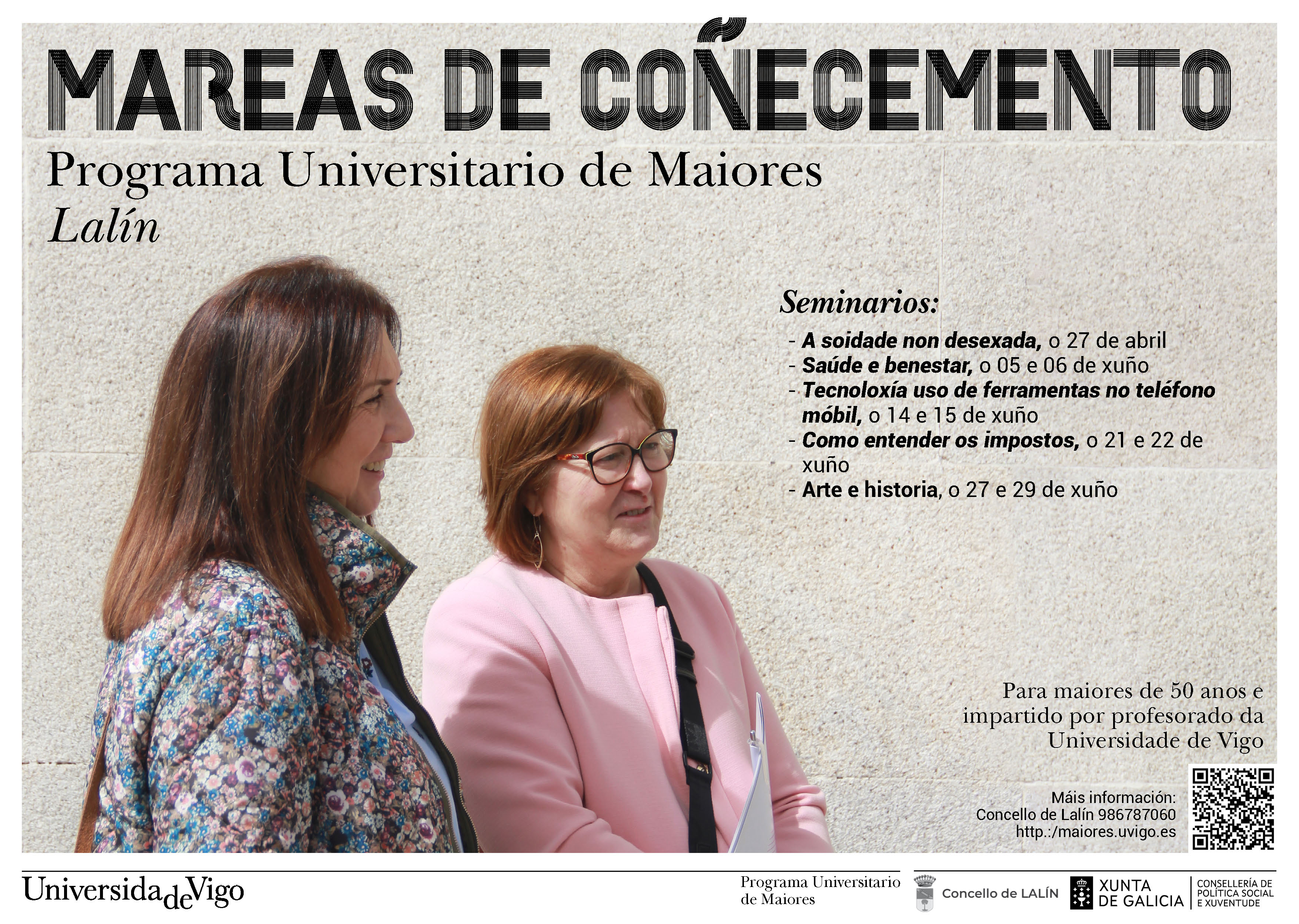 Ao abeiro deste acordo de colaboración entre Concello de Lalín e Universidade de Vigo preténdese desenvolver un conxunto de 5 seminarios gratuítos durante os meses de abril e xuño. A soidade non desexada, saúde e benestar, manexo de novas tecnoloxías, como entender os impostos e arte e historia centrarán as cinco sesións teórico-prácticas que abrangue esta formación. As persoas que desexen asistir deberán recoller a solicitude no departamento municipal de Políticas Sociais e rexistrar dita solicitude no Rexistro desde o 19 de abril. O máximo de prazas en cada seminario é de 30 persoas asistentes