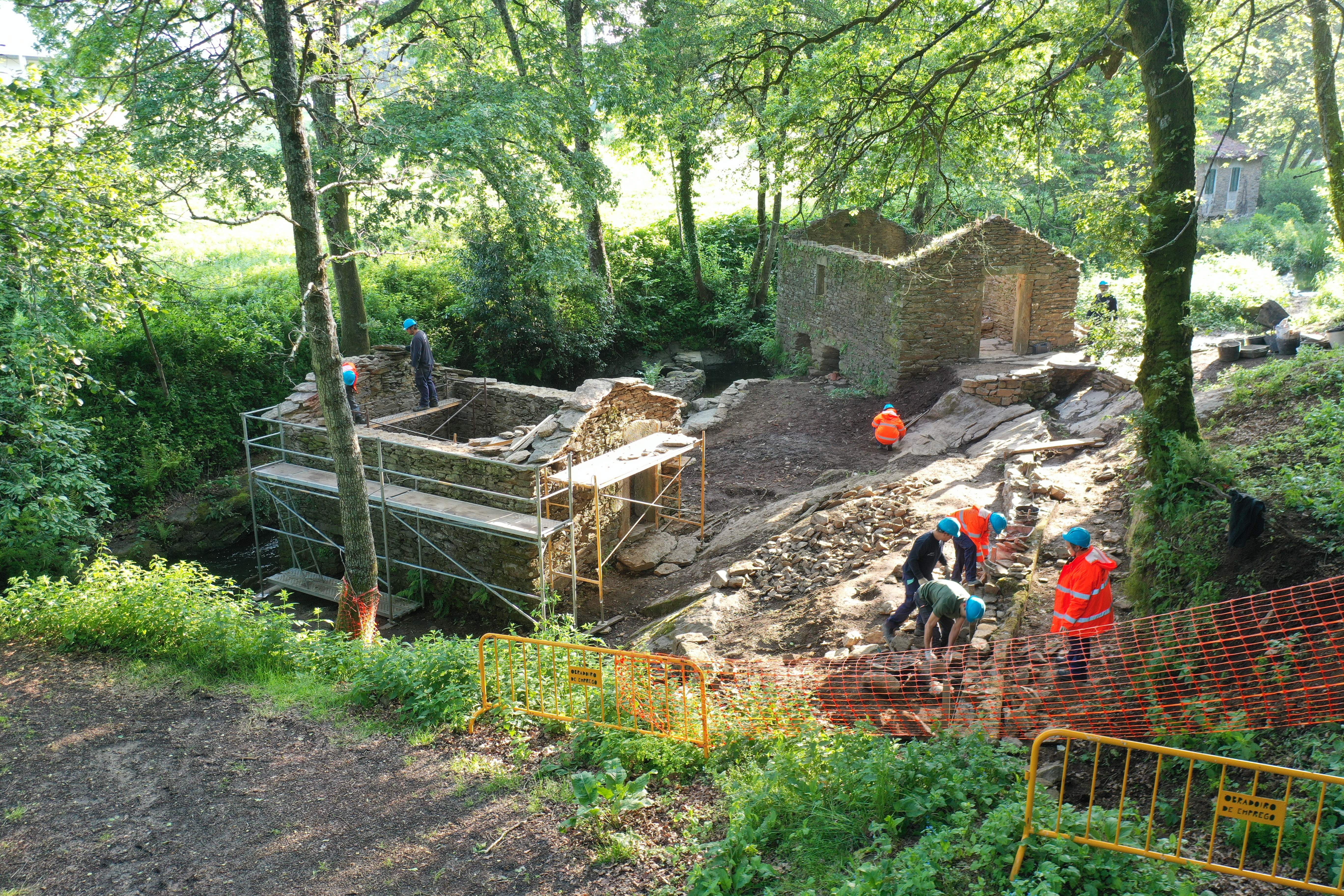 Nestes momentos terminouse practicamente de restaurar o cumio dun dos muíños e colocáronselle estadas que van a permitir asentar a estrutura de madeira do tellado para finais de mes. Cómpre destacar que todas as pedras utilizadas, tanto nos muíños (chans, paredes, …) como na restauración de canles ou dos muros foron recuperadas de tal xeito que se favoreceu a economía circular dos materiais sendo os alumnos os que as seleccionaron e colocaron manualmente facendo do proceso de construción un proceso eficiente en canto a recursos.