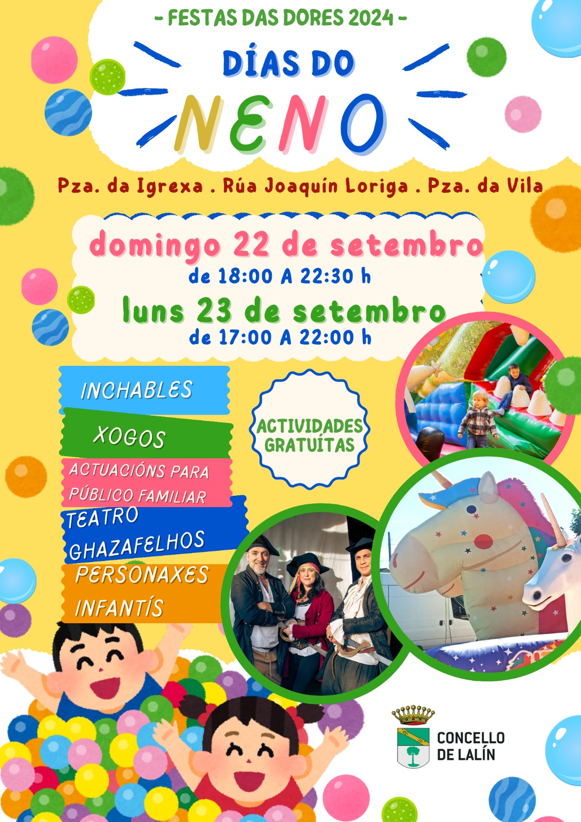 Neste sentido o edil avanza que “así mañá domingo 22 e o luns, día 23, celebraranse os <Días do Neno>, xornadas nas que a cativada lalinense poderá desfrutar de actividades variadas, todas gratuítas, como inchables, xogos, personaxes infantís e actuacións para público familiar na Praza da Igrexa, na rúa Joaquín Loriga e na carpa da Praza da Vila. O domingo 22 o horario en que estará habilitada esta programación de actividades, completamente de balde, para a cativada será desde as 18 a 22.30 h e o luns 23 desde as 17 as 22 h.